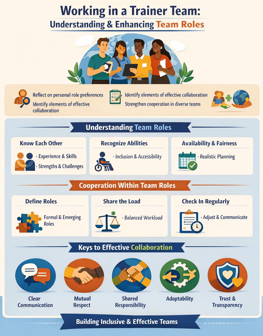 Working in a trainer team goes beyond dividing tasks. It involves understanding different skills, working styles, communication patterns, expectations, and responsibilities. Some roles are assigned, while others naturally emerge through experience, confidence, or group needs. This activity supports team members in exploring how roles are distributed, how they influence cooperation, and how to work in a more balanced, inclusive, and effective way.